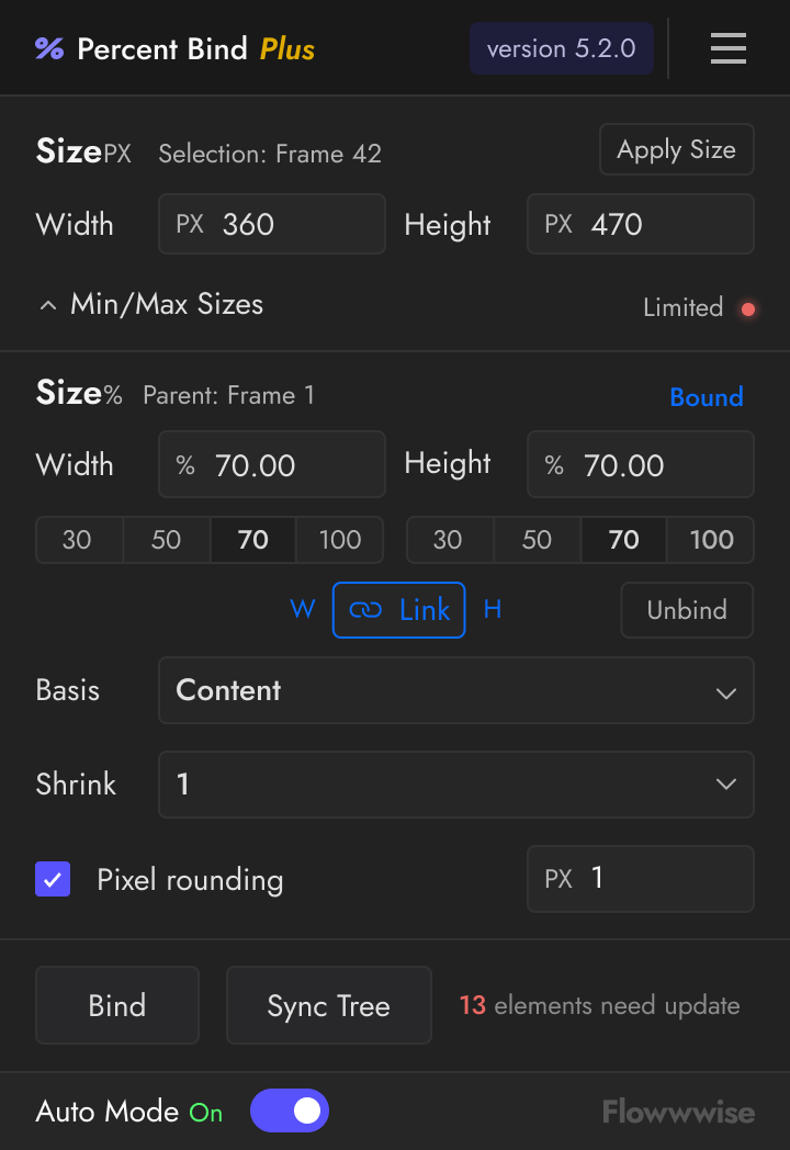Convert and bind sizes to percentages relative to their parent. Keep them in sync, batch-apply changes, and build responsive designs with confidence.